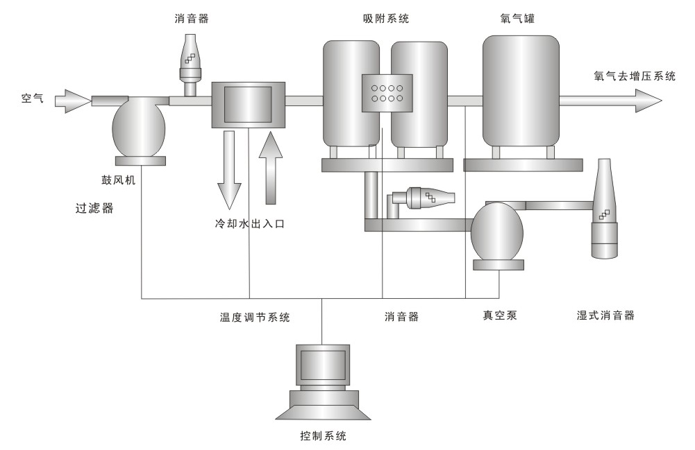 VPSA真空變壓吸附空分制氧,是用戶超大氣壓吸附真空解吸的流程,根據(jù)制氧分子篩在加壓下選擇吸附空氣中的氮氣,而未被吸附的氧氣富集在吸附塔頂部用為產(chǎn)品氣輸出,與此同時,另一吸附塔進行真空再生。當處于吸附件狀態(tài)的吸附塔臨近飽和之前,該塔自動減壓解吸再生,而另一只完成再生的吸附塔開始加壓吸附制取氧氣。如此循環(huán),兩只強附塔交替重復(fù)產(chǎn)氧和再生,實現(xiàn)連續(xù)制取氧氣。 氧氣和氮氣的沸點接近,兩者很難分離,一起在氣相得到富集。因此直空變壓吸附制氧裝置通常只能獲得純度90~90%的氧氣(氧的極限純度為95.6%,其余為氬氣)又稱富氧,與深冷空分裝置相比,后者能制取純度99.5%以上的氧氣。 |